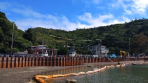 大宜味村白浜に行ってみた。戦争中に起こった日本兵による住民虐殺事件の現場を直に見たかったからである。場所は塩屋湾の海側の端の小さな集落、着くと最初に目に入ったのが白浜地区公民館、そこから小道を挟んだ真向いに白い浜辺がある。なるほど、白浜である。あいにく岸辺が工事中だったので、遠くから白い浜辺の写真を撮った。
